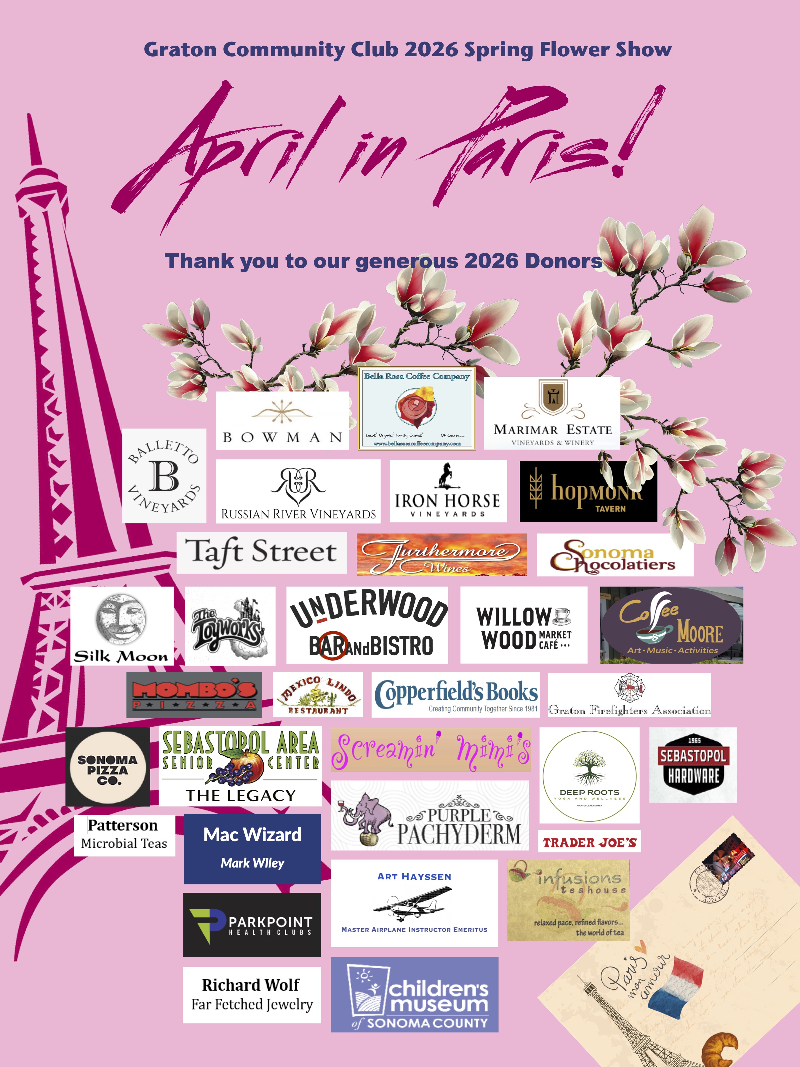 Our “April in Paris” Spring Flower Show and Plant Sale was wonderful – and is officially in the books! We are thrilled and grateful that so many visitors enjoyed the event on April 17-18, 2026. As always, our amazing volunteer Club members went above and beyond to produce a memorable and beautiful show, bringing a bit of “April in Paris” into our tiny hamlet in Graton, CA. The French-themed floral displays were spectacular, the lunch was healthy and delicious, and the musicians and singers were sparkling, jazzy and joyful. Enjoying the show with so many of our friends, families, neighbors and visitors was the perfect Springtime respite during these often intense and uncertain times… we thank you and appreciate your support!